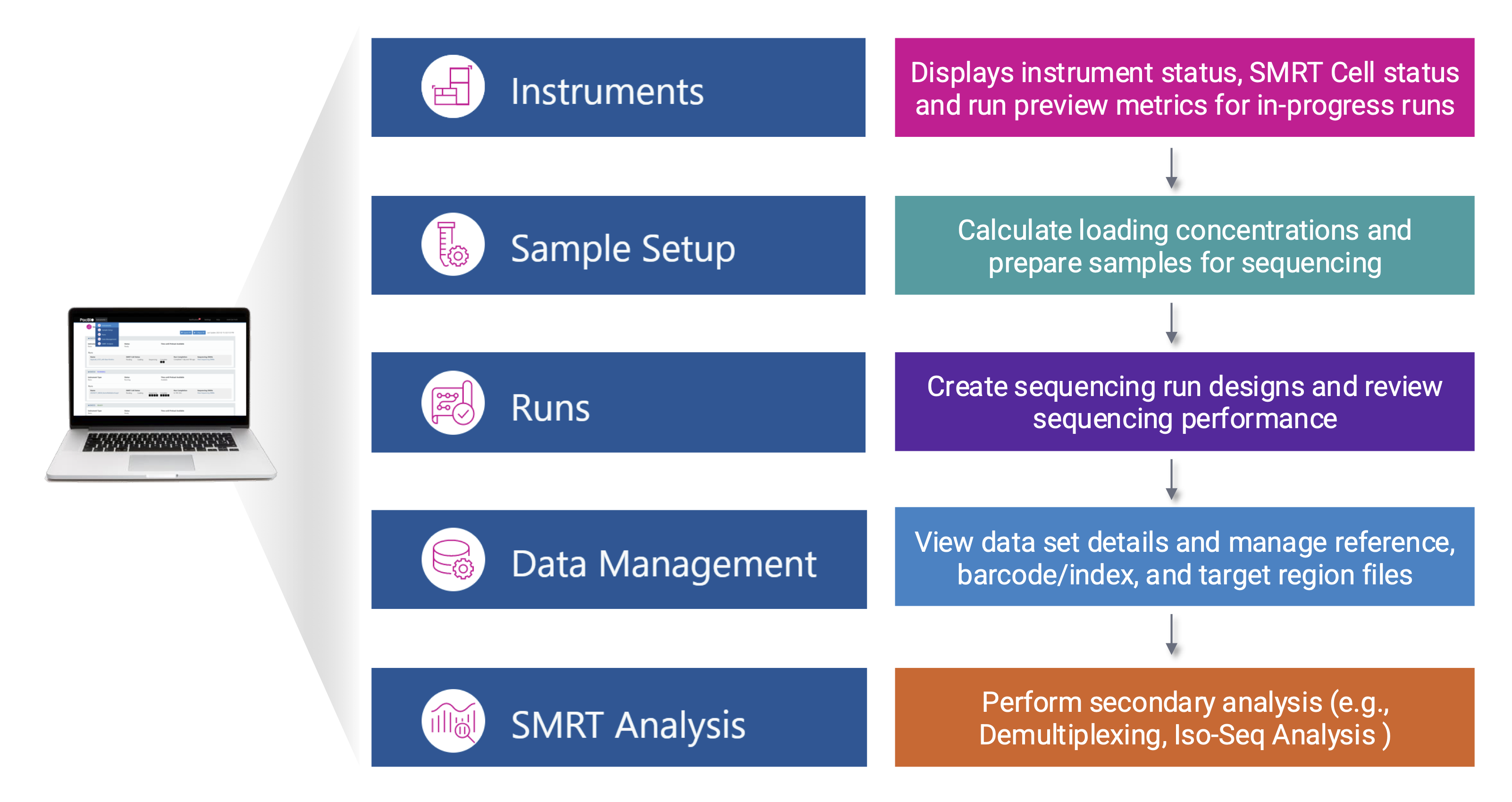 SMRT Link is free PacBio-provided software required for instrument management, sequencing run setup/monitoring, and viewing performance metrics. SMRT Link can also optionally be configured to run select analysis workflows – depending on compute resources available – by interfacing with existing job management systems (e.g., SLURM).