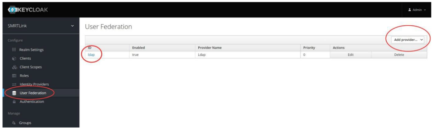 Configuring LDAP in Keycloak - LDAP is configured after SMRT Link is installed, using the Keycloak authentication server software, as shown below. - SMRT Link must first synchronize with your organization's LDAP objects before any directory accounts can be enabled and given a role to facilitate SMRT Link access.