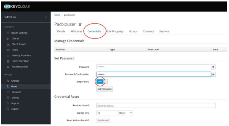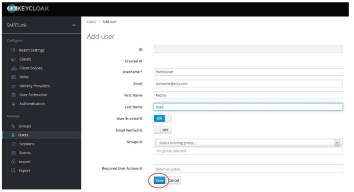 https://<hostname>:9443/admin/– where <hostname> is the host where SMRT Link is installed (the Keycloak console must be enabled). - Login using
