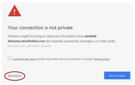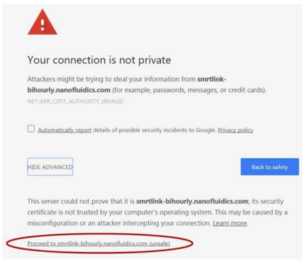 SMRT Link uses self-signed SSL certificate generated by the installer. If your site does not have a signed SSL certificate and you use the self-signed SSL certificate, each user will need to accept the browser warnings related to access in an insecure environment. You can also have your IT administrator configure desktops to always trust the provided self-signed certificate. Note that SMRT Link should be installed within your organization’s secure network, behind your organization’s firewall. Security messages display when users try to login to SMRT Link for the first time using the Chrome browser. These messages may also display other times when accessing SMRT Link. Each SMRT Link user in your organization should address these browser warnings following the procedure below.